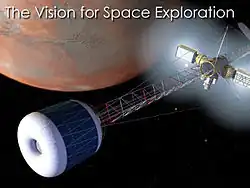 Following the success of the Apollo Program, von Braun advocated a crewed mission to Mars as a focus for NASA's crewed space program.[88] Von Braun's proposal used Saturn V boosters to launch NERVA-powered upper stages that would propel two six-crew spacecraft on a dual mission in the early 1980s. The proposal was considered by President Richard Nixon, but passed over in favor of the Space Shuttle.