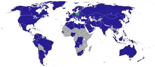 This article lists diplomatic missions resident in the Republic of Poland. At present, the capital city of Warsaw hosts 98 embassies. Several countries have ambassadors accredited to Poland, with most being resident in Brussels, Berlin or Moscow. This listing excludes honorary consulates.[1]