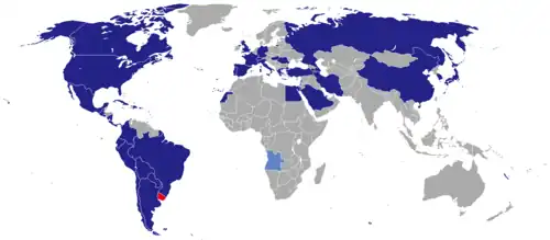 - ^ a b c d e f g h i j k l m n o p q r s t u v w x y z aa ab ac ad ae af ag ah ai aj ak al am an ao ap aq ar as at au av aw ax ay az ba bb bc bd be bf bg bh bi bj bk bl bm bn bo bp bq br bs bt bu bv bw bx by bz ca cb cc cd ce cf cg ch ci cj ck cl cm cn co cp cq cr cs ct cu cv cw cx cy cz da db dc dd de df dg dh di dj dk dl dm dn do "Misiones Diplomáticas Permanentes" [Permanent Diplomatic Missions]. Ministry of Foreign Affairs of Uruguay (in Spanish). 11 April 2025. Retrieved 5 August 2025.