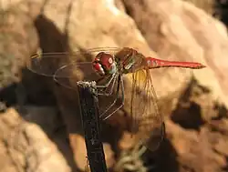 Most darters seen in Menorca with a very red colouring are S. fonscolombii but some are C. erythraea which occurs in many of the same locations. On close observation these two species can be told apart as they have quite different body shapes. Also S. fonscolombii usually oviposits in tandem whereas female C. erythraea oviposit solo.