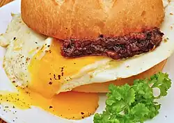 | Buttered eggs | Plain | England | Scrambled eggs with additional butter melted and stirred into the egg mixture before cooking.[7] | |