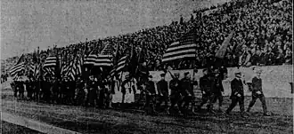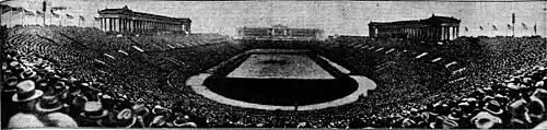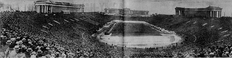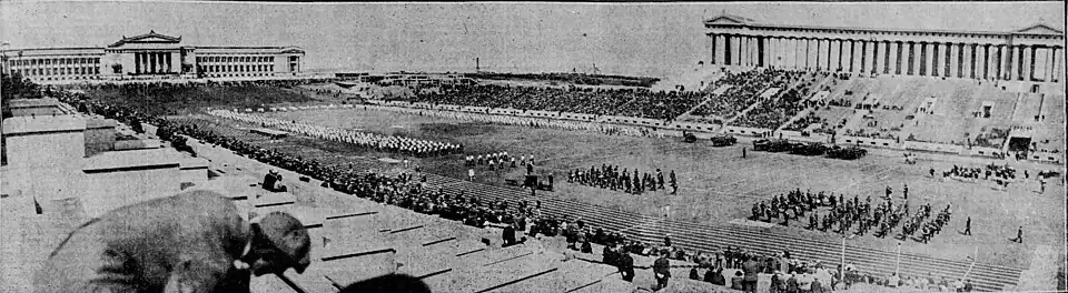 September 6: opening day on Saturday for the first dedicatory event at the "Grant Park Stadium" an athletics meet with policemen as participants. This event was a fundraiser for the Chicago Police Benevolent Association, which provided support for police widows and officers disabled in the line of action. The meet's official opening ceremony on the second day featured 1,200 police officers parading through the stadium, fireworks, and music by two police bands, among other entertainment. The contests in the event included a chariot race and a game of motorcycle polo. The opening ceremony was attended by 45,000 spectators. Events raising funds for Chicago's Policemen and Firemen Benevolent funds were a mainstay at Soldier Field until 1971.[1][10][11][12][13][7]