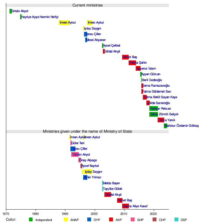 The Ministry of State position, where women were most frequently appointed with 15 appointments during this period, was abolished in 2011.[100] A new ministry called the Ministry of Family and Social Policies was established to replace the Ministry of State Responsible for Women and Family.[101] Five different ministers served in the newly established ministry until 2018, and all of these ministers were elected from women. In 2018, the ministry was merged with the Ministry of Labor and Social Security to create the Ministry of Family, Labor and Social Services.[102][103]