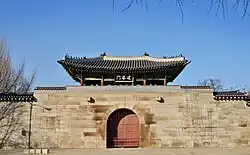 A watchtower that used to be on the eastern palace walls. It was likely originally built in 1398 and demolished in 1427.[56] It was rebuilt in the 6th month of 1866.[56] It became separated from the palace walls around the 1929 Chōsen Exhibition.[57][26][58] It served as the centerpoint of the outer main entrance to the entrance of the exhibit; the relocated Gwanghwamun was the inner main entrance.[59] |