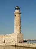 1864 | ? m | ? m | This lighthouse is located at the tip of a stone fortification. It consists of a lantern and gallery atop a stone column resting on a square base of stone. The top third of the column round, the bottom two-thirds being octagonal. The structure is unpained. The Venetian lighthouse of the Port of Rethymnon is the second largest Egyptian Lighthouse of Crete, after the lighthouse of Chania.[5] | |
