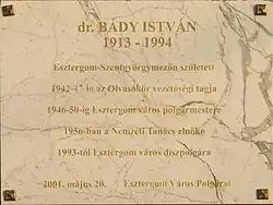 Plaque of dr. István Bády in Szentgyörgymező