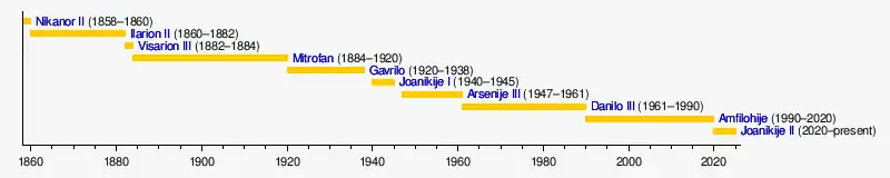 2020–present | Served as the administrator of the Metropolitanate from October 2020,[3] prior he was officially elected Metropolitan by the Bishops' Council in May 2021.[4][a] Born in Velimlje as Jovan Mićović / Јован Мићовић. |