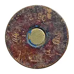 In 1953, US Army Intelligence ordered 250 million rounds of .30-06 ammunition to be manufactured in large lots under unique arsenal headstamps.[4] The case had red lacquer sealant around the primer annulus.[4] The headstamp has a two-letter manufacturer code (10- and 2-o'clock) and the lot code (rather than the year) is the number 40 (at 4 o'clock) followed by a third numeral (at 8 o'clock). This was divided by radial segment lines, like that of a Square (or Hellenic) Cross, between the portions to look like they were of European manufacture.[4] The cartridges were intended to be aid to anti-Communist insurgents and Allied forces equipped with US weapons. They were loaded in 5-round stripper clips in M1 bandoleers (holding 6 × 5-round clips in cardboard spacers, or 60 rounds each) packed in US Navy 20mm Mark 1 metal ammo chests (33 × 60-round bandoleers; or 1980 rounds each). The chests were painted Olive Drab Green with subdued black lettering.