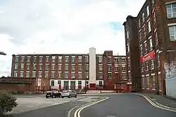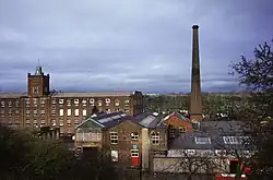 Grade II listed building[7] Powered by a J&E Wood, 2000 ihp, horizontal cross compound, Corliss valves with superheated steam. Initially 4 Lancashire boilers fifth Yorkshire boiler added in 1918. The 24 ft flywheel was geared for 44 ropes. The chimney was 77 yds tall, later reduced to 60, when the mill was lengthened to 427 ft in 1918 it housed 127,400 mule and 12,600 ring spindles[2][8] |