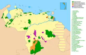 The national parks of Venezuela are protected areas in Venezuela covering a wide range of habitats. In 2007 there were 43 national parks , covering 21.76% of Venezuela's territory.