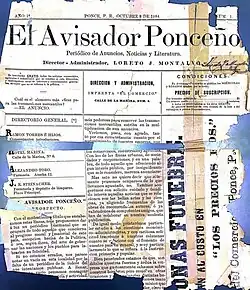 | El Avisador: periódico literario, de intereses materiales, mercantil, y de anuncios.[91][93][94] | Ponce[95] | 1874 (May 21)[91][93] | 1875[91] | Print copies are available at the UPR-JML Library (v.1., n.1. (May 1874) to v.1, no.45 (Apr 1875)), and at Archivo General de Puerto Rico (v.1, no.14 (Aug 1874) to v.1, no.19 (Sept 1874)).[96] | Published on Thursdays.[97] Ramón Marín, founder; Loreto Montalvo, editor[91] |