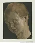 - ^ The copy at the Museum der bildenden Künste, Leipzig, shows a monogram in the open book of the statuette on the reveal; also missing in the supposedly original in Berlin the inscription on the sheet of paper on the wall at the top right reads: "Also pin ich gestalt / Jn achcehe Jor altt / .1.4.9.7." (I am 18 years old). The Fürleger insignia below is a later addition, also in the Portrait of a Young Woman with Her Hair Down.