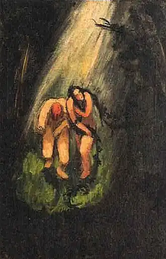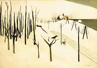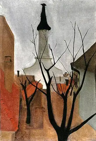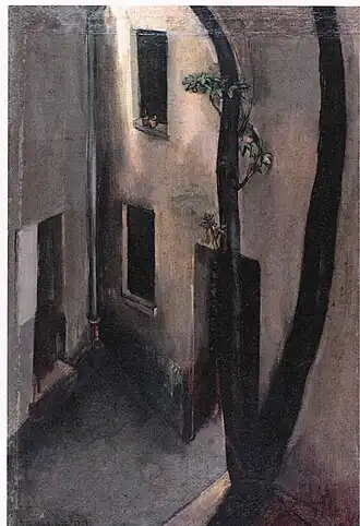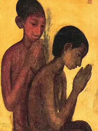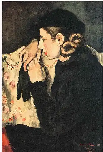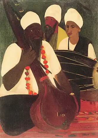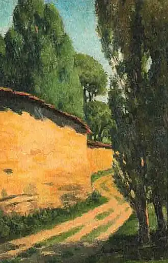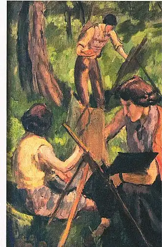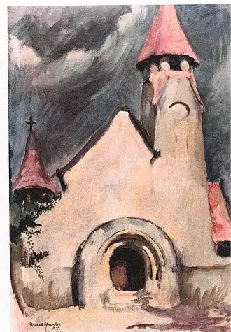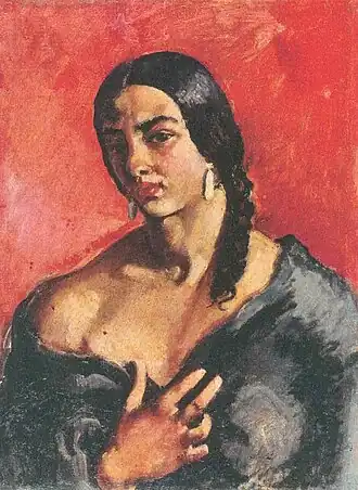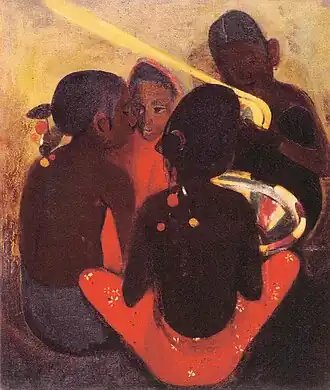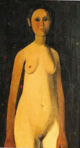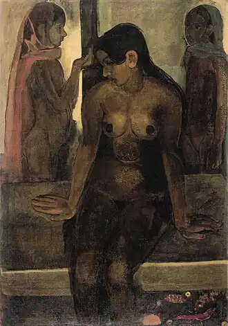 In her early years, Sher-Gil was a frequent visitor to Zebegény, in Hungary.[5] There she painted a church in 1932, and would several years later paint other views of the village including Winter and the Merry Cemetery.[5] The early 1930s were also the years she worked at the École des Beaux-Arts, Paris, painted mostly family and colleagues, and won awards at the annual competitions for portrait and still life for three years in a row.[6] In the summer of 1932, she submitted six paintings to the "end of year concours", Paris, for which she received second mention in her capacity as foreigner.[7] The six included Violins, Nude Self-Portrait with Palette, and Young Girls.[7] In her words, "my work in those days was absolutely Western in conception and execution except for the fact that it was never entirely tame or conventional".[6]
