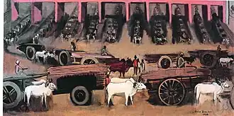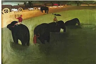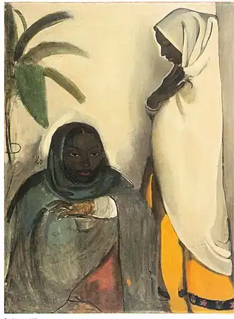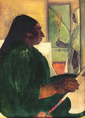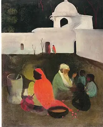 In 1938 five of Sher-Gil's paintings were exhibited at the All India Fine Arts and Crafts Society's exhibition in Delhi, and included Elephants Bathing in a Green Pool (1938), Composition (1936), and View from Studio (1934), which won the prize.[20] In the same year she married Viktor Egan in Hungary, and there painted Two Girls among others.[21] Returning to India in 1939, she moved to Saraya, Uttar Pradesh, and there her creations included Woman on Charpoy, Elephant Promenade, The Ancient Story Teller, and Haldi Grinders.[21][22] The dome of the family's estate features in the background of some of these, though she omits the Saraya Sugar Mills and its chimneys and smoke.[23]