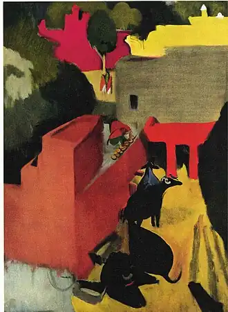 By 1948, the Indian government had acquired 98 of Sher-Gil's paintings.[24] Following her father's death, several paintings of hers were saved by Hungarian-Indian social worker Fori Nehru.[25] The art restorer, Rupika Chawla, found several of Sher-Gil's paintings to have been altered by Sher-Gil herself.[26] These include Siesta, Woman Holding Fan, and Hillside.[26] In 1979 her works including Camels and Ancient Story Teller, were displayed at an exhibition in New delhi, organised by the Budapest Kunsthalle.[9]