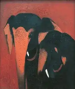 In 1940, six of Sher-Gil's works were displayed at the Indian Academy of Fine Arts' Amritsar Exhibition (31 October – 10 November), to raise money for the War Fund.[22] These included Siesta, Sleep, Elephant Promenade, Elephants, The Swing, and the winning piece, The Ancient Story Teller.[22] Sher-Gil died at midnight on 5 December 1941, leaving The Last Unfinished Painting at Lahore.[21]