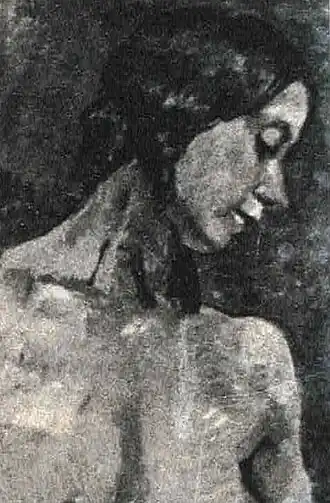 Depicts Sher-Gil with a shoulderless dress and loose hair.[30][31] |