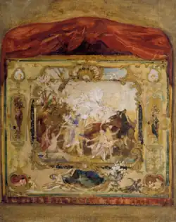 Design for a Curtain for the Karlovy Vary Municipal Theater[10] | 1884/1885 | Oil on canvas, 52.7 cm × 42.5 cm | Österreichische Galerie Belvedere, Vienna[10] | When Klimt and his two colleagues (Ernst Klimt and Franz von Matsch) received the commission to design the curtain for the Karlovy Vary Municipal Theater around 1884, they already had considerable experience in the field of theater design. Klimt's design for was directly inspired by similar curtain designs by Hans Makart.[10] |