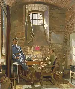 William Orpen was a highly successful portrait painter with the New English Art Club; painting numerous members of Edwardian high society.[1] Following the outbreak of World War I, and the death of his friend, the art collector Hugh Lane who died aboard the RMS Lusitania, he enlisted with the British Government as an official war artist on the Western Front.[2] His works, which ranged from portraits of military officials to depictions of shell-shock, and war-torn landscapes, were received with great acclaim. As a result, he was selected to paint the Paris Peace Conference overseeing the end of the conflict.[3]