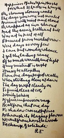 Handwritten version of 'Happiness Makes Up in Height For What It Lacks in Length' by Robert Frost. Found inscribed in a Robert Frost book in the Special Collections Library at Duke University. Date of signature in the book predates formal release in publication of the poem.