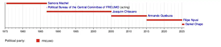 | 1 | Samora Machel (1933–1986) | 25 June 1975 | 19 October 1986 † | 11 years, 116 days | FRELIMO | 1977 | |
