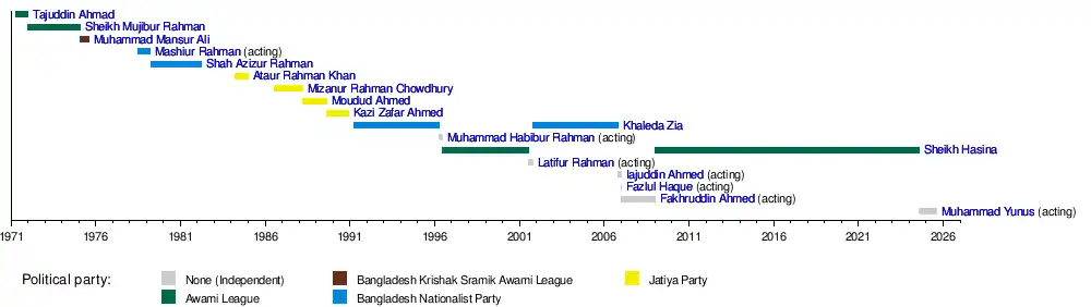 This article lists the prime ministers of Bangladesh, and includes persons sworn into the office of Prime Minister of Bangladesh following the Proclamation of Independence and the establishment of the Provisional Government in 1971. Moreover it also lists the chief advisers of caretaker governments of Bangladesh, which is a position equivalent to that of the prime minister, and is sometimes colloquially referred to as the prime minister.[1]