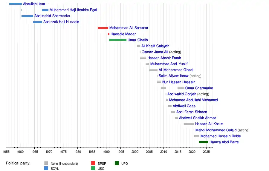 The prime minister of Somalia (Somali: Ra'iisul wasaaraha Soomaaliya) is the head of government of Somalia. There have been 22 official prime ministers since the office was created in 1956. The first prime minister was Abdullahi Issa, who served prior to independence in the Trust Territory of Somaliland. The current prime minister of the Federal Republic of Somalia is Hamza Abdi Barre,[1] approved by the House of the People on 25 June 2022.[2]