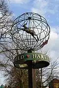 Harefield village green main (globe) sign | The Green (public green) partly facing the south end of the large hospital site 51°36′11″N 0°29′02″W / 51.603°N 0.484°W |
