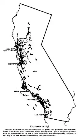 These California land grants were made by Spanish (1784–1821) and Mexican (1822–1846) authorities of Las Californias and Alta California to private individuals before California became part of the United States of America.[1] Under Spain, no private land ownership was allowed, so the grants were more akin to free leases. After Mexico achieved independence, the Spanish grants became actual land ownership grants. Following the Mexican–American War, the 1848 Treaty of Guadalupe Hidalgo provided that the land grants would be honored.
