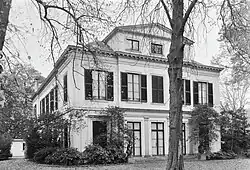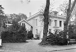 White villa with rectangular corner towers and a double service building Huis House 1871 A. van der Steur Donkerelaan 2 52°24′33″N 4°36′56″E / 52.40923°N 4.61554°E / 52.40923; 4.61554 (RM511140 - Donkerelaan 2) 511140