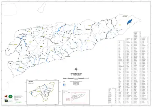 The people of Timor-Leste often have no single common name for, or any single spelling of any name allocated to, a particular river. Further, an East Timorese river may change its name several times between its source and its mouth.[13] The names set out below are therefore not necessarily authoritative, either as to the name of a river, or as to the spelling of any particular name.