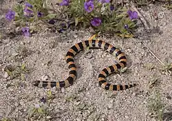 Note: Often lacks red bands - Desert kingsnake (Lampropeltis splendida)