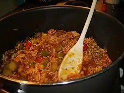 Dirty rice Dirty rice is a dish from Louisiana. The name is from rice cooked with poultry, beef or pork and with green bell pepper, celery, and onions.[105]