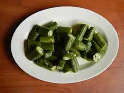 Okra[85] A vegetable that is native to West Africa and is eaten fried or stewed and is a traditional ingredient of gumbo. It is sometimes cooked with tomatoes, corn, onions and hot peppers. In West Africa and in African-American cuisine, okra is used to thicken stews and soups.[86] In Gullah communities, cooked okra soup is prepared with "...tomatoes, and smoked meat served over rice."[87]