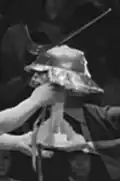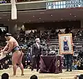At the end of the anthem, the commentator finally announces the wrestler's full shikona name and proclaims him the winner of the tournament. As a first step, three prizes are then awarded to the winner. The first trophy awarded is the Emperor's Cup by the JSA chairman. This particular trophy is presented on the theme of Act 3 of George Frideric Handel's Judas Maccabaeus ('See the Conquering Hero Comes!').[6] Then, the JSA championship flag is awarded by the chairman of the JSA judging department and the Prime Minister's Cup is also awarded. The champion is then interviewed at ringside by an NHK commentator. After the interview, the main part of the awards ceremony takes place in the following order: diplomatic, municipal and corporate trophies and, for special tournaments such as the first or last of the year, special trophies such as the trophy rewarding the wrestler with the most wins in the year or the best makuuchi newcommer.