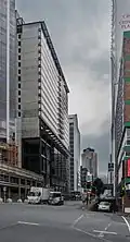 Another building to be called Auckland's first skyscraper was the Civic Administration Building (now shortened to CAB Building), built in 1966. The twenty-storey tower was comfortably the tallest building in Auckland at the time, and housed the city council from its completion until it left in 2014.[5][6] An example of modernist architecture, it incorporated unique building techniques, such as flexible steel framing, aluminium extrusions, neoprene window seals and ceramic acoustic tiles.[7]