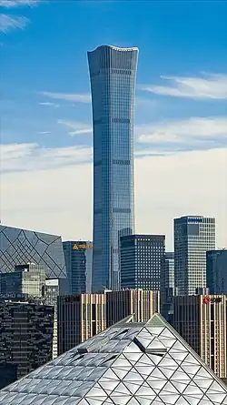 ![]() The Beijing CBD with China Zun in the center and China World Trade Center Tower III on the left | |