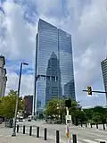 The 4th-tallest building in Ohio and the tallest building constructed in the city in the 1980s.[15][16] Built as the Sohio Building and also known as the BP Building (HQ of BP America from 1985 until 1998 when BP moved to Chicago), the building is the regional headquarters of Huntington National Bank, and American headquarters of Cleveland-Cliffs Inc.. The public atrium features a series of water fountains that end at the Euclid Avenue wall with a falling water curtain that one can walk all the way around. The floor in the atrium is solid marble and the skylight allows one to see the stepped "crown" 658 feet straight up the facade from the tower floor. |