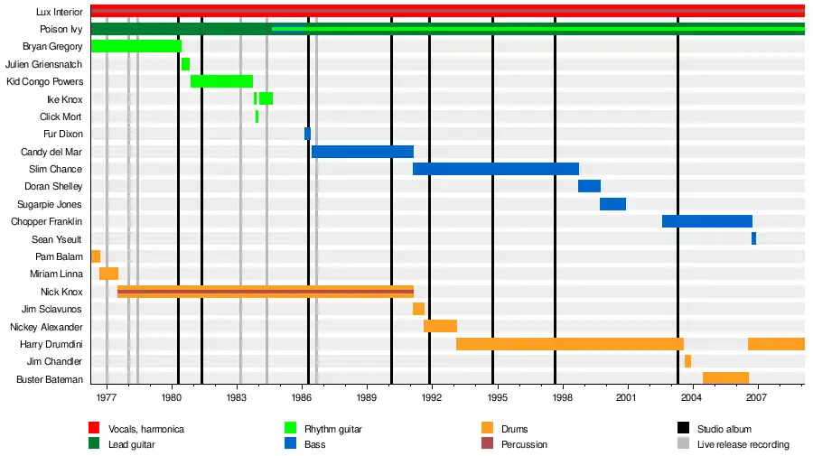 Lux Interior, Poison Ivy, Bryan Gregory and Pam Balam (Gregory's sister) formed the Cramps in April 1976.[1] After just a few months, Balam was replaced by Miriam Linna.[2] She remained in the group until shortly after its first headlining show in July 1977, when Nick Knox (Nick Stephanoff) took her place.[3] After releasing three singles and a debut album, Songs the Lord Taught Us, Gregory left the Cramps at the end of May 1980 following a show in Berkeley, California.[4] He was briefly replaced during the summer of 1980 by Julien Griensnatch (Julien Hechtlinger),[5] before Kid Congo Powers (Brian Tristan) took over before the end of the year.[6]