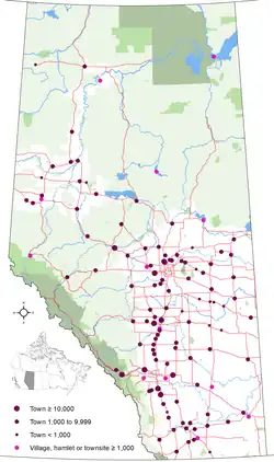 A town is an urban municipality status type used in the Canadian province of Alberta. Alberta towns are created when communities with populations of at least 1,000 people, where a majority of their buildings are on parcels of land smaller than 1,850 m2, apply to Alberta Municipal Affairs for town status under the authority of the Municipal Government Act.[1] Applications for town status are approved via orders in council made by the Lieutenant Governor in Council under recommendation from the Minister of Municipal Affairs.[1]