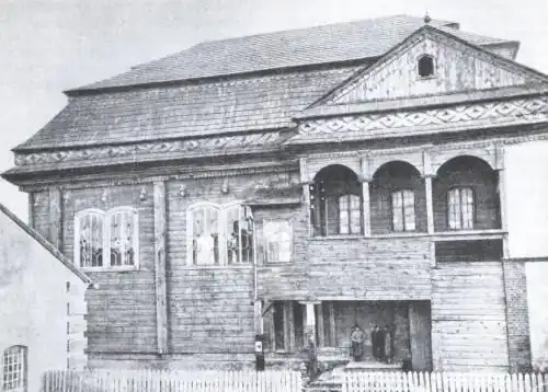 1744–1943 | The rectangular synagogue had a hipped roof with a smaller gable on the west. The roof protruded well beyond the building and was supported on all four sides by wooden pillars. In the west there was a vestibule and another room at ground level. This was followed by the main hall, the men's prayer room. Above the vestibule and the adjoining room was the women's prayer room, which was accessible via an outer staircase. In the middle third of the stem was another small stem. The main hall had rectangular windows, the other rooms had smaller, square windows. The bima in the form of an octagonal arbor stood almost in the middle of the main room and was surrounded by a balustrade. The Torah shrine on the east wall was framed by a pair of columns and had a top with a crown. After 2014, a replica was built in the open-air museum for folk architecture in Sanok 150 km away.[34] |