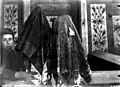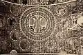 1750–1941 | The synagogue building was a wooden structure built on a stone foundation. The walls of were cut from edged logs into a clean corner. The central log house was dominant in height, to which side log houses were adjoined as covered galleries. A pentagonal structure was added to the main facade, which covered the main entrance. The building was covered with a high gable roof, with a complex plan and numerous outbuildings. In the end of 19th - beginning of 20th century the roof was covered with tin.[6] The interior was almost entirely covered with magnificent polychromes made in 1745 by the Słuck painter Chaim ben Yitzchak ha-Levi Segal. Murals, made on boards, represented the images of 12 signs of the zodiac, mythical animals and cities. Some researchers noted that under the image of mythical cities features of Mogilev from the times of the Polish-Lithuanian Commonwealth were visible. These murals were studied by El Lissitzky and Issachar Ber Ryback. | ![]() ![]()