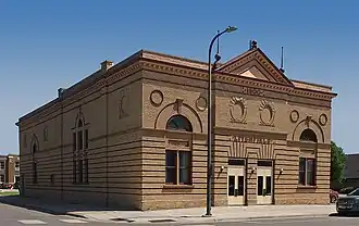 The building is a well-preserved example of Renaissance Revival architecture, which is otherwise rare in Litchfield and Meeker County. Most of the façade is yellow clay brick, manufactured locally, and accented with red brick and red terra cotta patterns. The opera house opened on November 8, 1900, with the play "The Marble Heart" starring William Owen. Besides operas and performances, the auditorium housed town meetings, elections, military recruitment, and other government functions. Somewhere between 1930 and 1939, the interior was remodeled for use as city offices. In 1983, when the building was nominated to the National Register, it housed civic offices and organizations, and it was used as a meeting place for senior citizens, the Girl Scouts, and community education. Public officials and the Litchfield Police Department also used some of the rooms.[2] In 2002, the city removed its offices from the building and moved its offices to trailers in the parking lot.[3] This move was made because mold was found in the building. The city completed its new city hall in 2006, but the fate of the building had not been decided yet.[4] In 2008, the city sold the building to the Greater Litchfield Opera House Association, Inc. for $100,000. The city accepted a 1900 silver dollar for payment and specified that the balance of the purchase price would be invested in the building to renovate it for the community.[3]