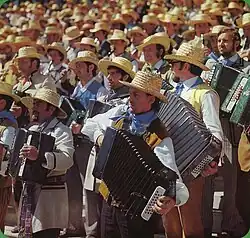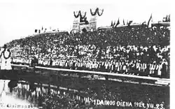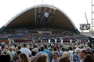 The Lithuanian Song and Dance Festival (Lithuanian: Lietuvių dainų ir šokių šventė), colloquially known also as the Song Celebration (Lithuanian: Dainų šventė) is a Lithuanian massive traditional song and dance festival.[1] It takes place roughly every four years. The event has been a national celebration throughout the interwar and upon Lithuania regaining its independence in 1990. The main event is traditionally hosted at Vingis Park in Vilnius.