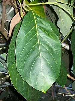 Litsea bindoniana, known as the big-leaved bollywood is a rainforest tree in the laurel family. A small to medium-sized bushy tree endemic to the rainforests of tropical Queensland, Australia.[2] It features large leaves with attractive yellow venation, 25 cm (10 in) long by 10 cm (4 in) wide. They are dark green above, and paler and somewhat hairy below. The leaf stalks are hairy. The small (0.7 cm diameter) greenish flowers are fragrant and occur from March to May. They are followed by fruits which mature from September to October, being a black drupe. Regeneration is from fresh seed, after removing the fleshy aril around the seed.[3]