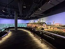 The Toronto destination, which took over 35,000 hours to design and build, includes GO Transit trains and Union Station,[11] the Art Gallery of Ontario, Toronto City Hall,[4] helicopters, streetcars,[3] the Don Valley Parkway,[4] and the Gardiner Expressway.[5] During the morning portion, sound effects include chirping birds, barking dogs, and garbage trucks making rounds.[3] During the sunset portion of the exhibit, the skyline is lit by 30,000 LEDs,[3] with sounds of crickets and sirens.[8] The replica of the Rogers Centre, which cost $60,000 to build and occupies a space of 5 by 5 feet (1.5 by 1.5 m),[5] has a functional retractable roof and contains a scoreboard that will show highlights from the preceding day's Toronto Blue Jays game.[3] The field depicts the instance Joe Carter hit a walk-off home run to clinch the Blue Jays' victory in the 1993 World Series against the Philadelphia Phillies.[8]