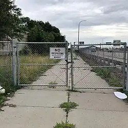 In 2018, Little Earth Trail was the location of a sprawling 70-tent, 120-person homeless camp that represented social problems in the area, such as historic displacement of American Indian people, lack of affordable housing, and ineffective social services.[6] The camp along Hiawatha Avenue closed in December 2019. Some grassy areas next to the trail were fenced off with "NO TRESPASSING" signs, but portions of Little Earth Trail remained open to bicyclists and pedestrians.[7] People in the Phillips community refer to the area as "The Wall of Forgotten Natives," which literally represents a large, concrete sound barrier along the Hiawatha Avenue transit corridor and the issues facing former camp residents.[8]