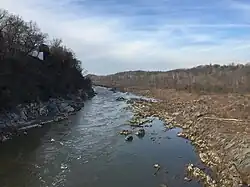 Little Falls is an area of rapids located where the Potomac River crosses the Atlantic Seaboard fall line where Washington, DC; Maryland; and Virginia meet. Descending from the harder and older rocks of the Piedmont Plateau to the softer sediments of the Atlantic coastal plain, it is the first upstream "cataract", or barrier, to navigation encountered on the Potomac River.[2] It may be viewed from the heavily trafficked Chain Bridge, about a half mile downstream. It is named in contradistinction to Great Falls, about 5 miles further upstream.