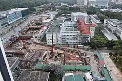 A 58-metre (190 ft) section of the DTL tunnel below the NEL tunnels had to be manually mined due to the hard ground and the large boulders underground.[34] At the DTL station site, a boulder about the size of a double decker bus was also broken into smaller pieces using specialised hydraulic machinery.[35] On the night of 26 March 2014, a fire started at the construction site but was put out in 30 minutes, said the LTA.[36][37] As announced by the LTA in April 2015,[38][39] the DTL station opened on 27 December.[9]