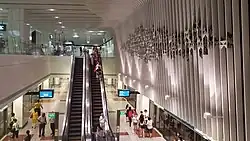 The DTL station was designed by Architects61, which adopted a flowing fabric theme reminiscent of the Indian sari to reflect the vicinity's heritage.[47][48] The NEL and DTL platforms are wheelchair-accessible. Tactile paving, consisting of tiles with rounded or elongated raised studs,[49] guides visually impaired commuters through the station with dedicated routes that connect the station entrances to the platforms or between the lines.[7] Wider fare gates allow easier access for wheelchair users into the station for both lines.[5][50]